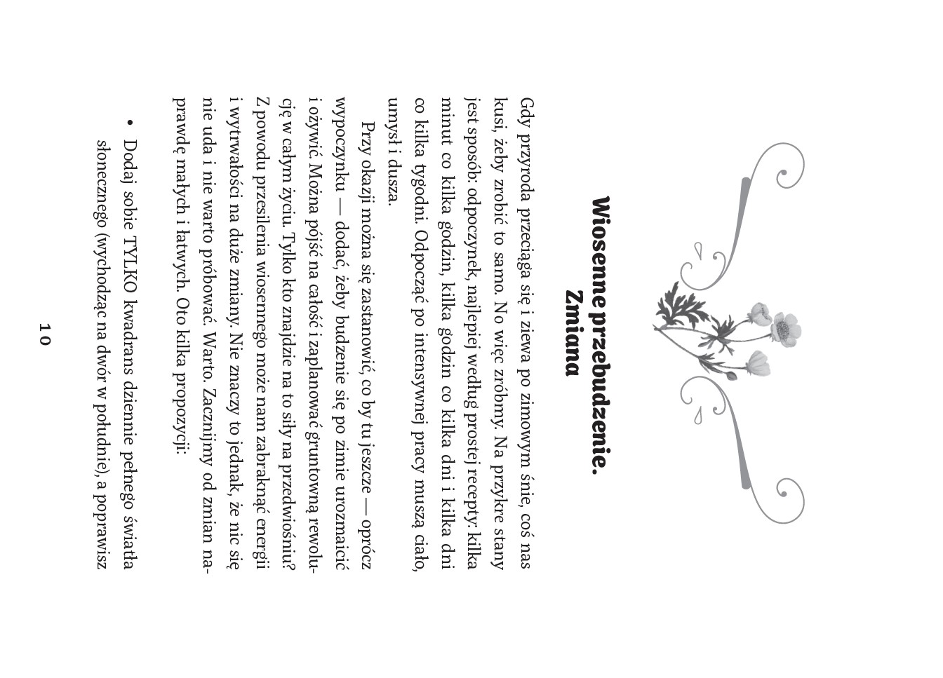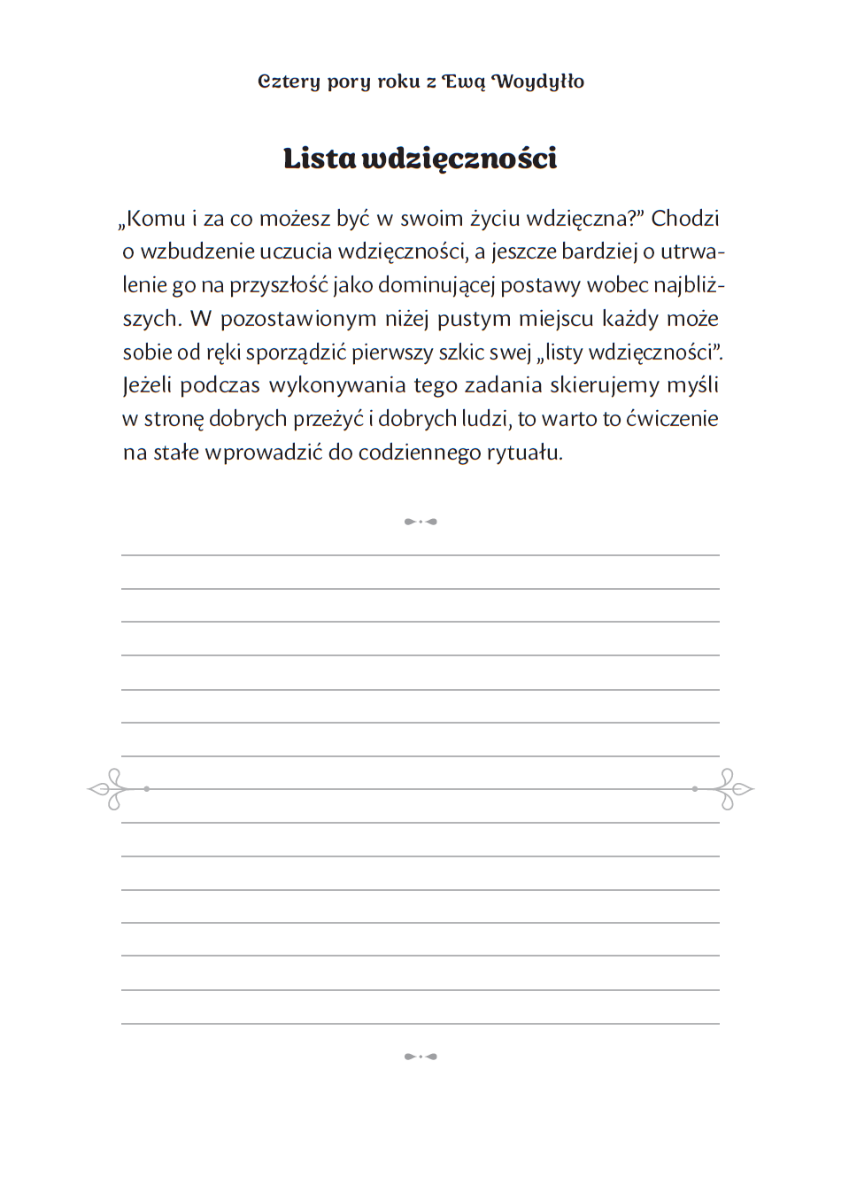 Ewa Woydyłło motywuje do pielęgnowania kobiecości w rytmie zmieniających się pór roku. Zainspiruj się ich energią – radością wiosny, sytością lata, mądrością jesieni, spokojem zimy. Zacznij od małych kroków, zwyczajnych decyzji, prozaicznych wyborów – to z nich rodzą się wielkie zmiany. Zadawaj sobie pytania, zaufaj emocjom, zapisuj myśli i nie zapominaj o dobrych afirmacjach – one naprawdę działają.