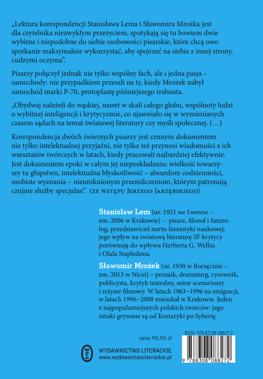 Dwaj wielcy pisarze. Dwie odmienne osobowości, dwa różne temperamenty. Wydawać by się mogło, że Stanisława Lema ze Sławomirem Mrożkiem niewiele łączyło. Okazuje się jednak, że pisarze przez wiele lat byli przyjaciółmi i pisali do siebie arcyciekawe listy. Nie tylko o literaturze, nie tylko o wielkiej polityce, ale i o czymś tak przyziemnym jak… samochody, których byli wielkimi miłośnikami. Mnóstwo w tej korespondencji ironii, słownych gier i żartów.