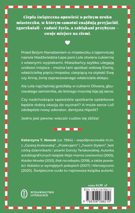 Tuż przed Bożym Narodzeniem w sercu miasteczka Niedźwiedzia Łapa pani Lola otwiera wymarzoną cukiernię, pełną aromatycznych wypieków, które podbijają serca mieszkańców. W jej progu spotykają się najróżniejsi ludzie: wdowa Elwira, która nie rozstaje się ze swoimi pięcioma mopsami, Ewa zmagająca się z otyłością, Anna, która stara się pogodzić życie rodzinne z zapracowanym mężem, i wielu innych, szukających choć odrobiny ciepła i uśmiechu.