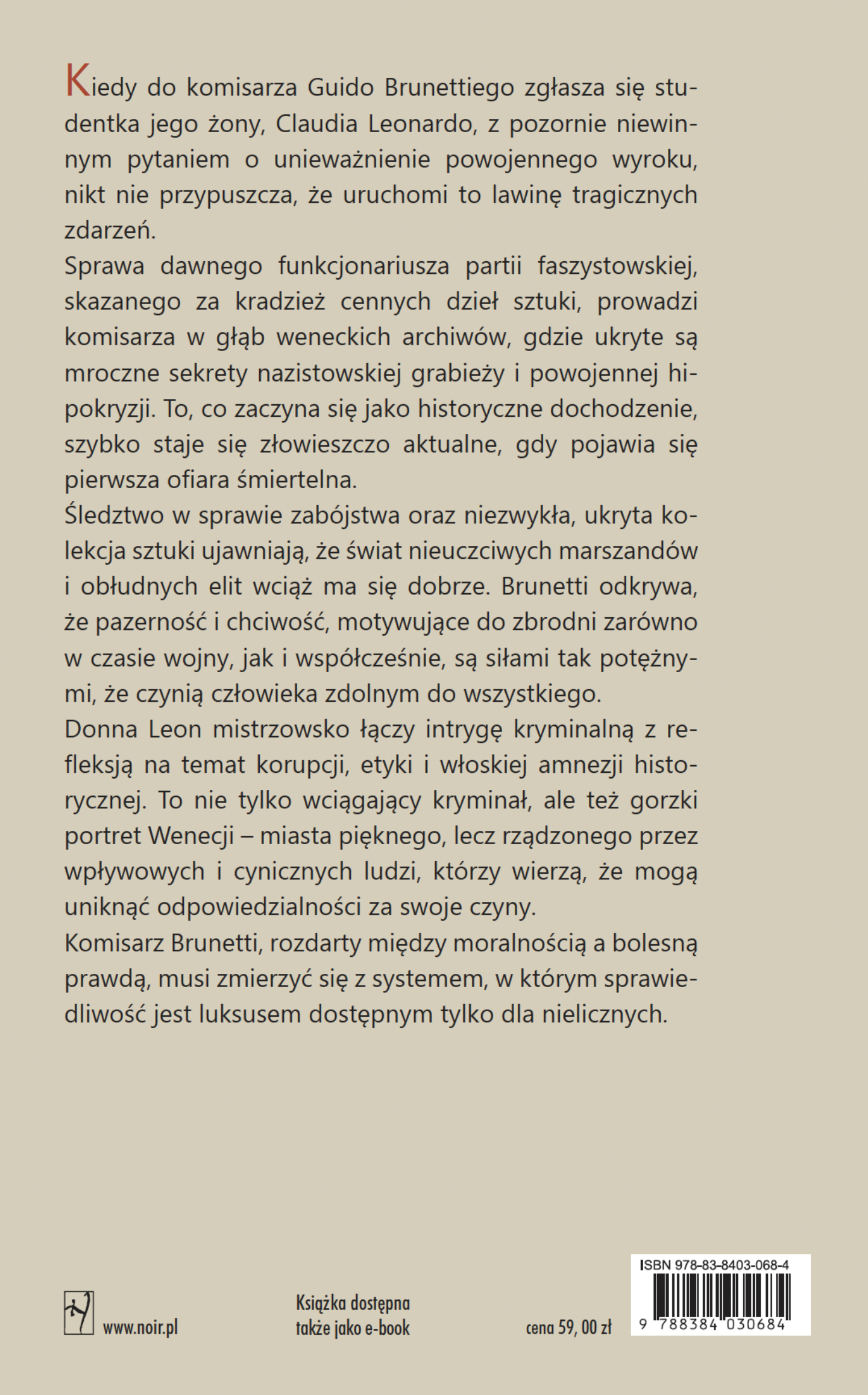 Donna Leon mistrzowsko łączy intrygę kryminalną z refleksją na temat korupcji, etyki i włoskiej amnezji historycznej. To nie tylko wciągający kryminał, ale też gorzki portret Wenecji – miasta pięknego, lecz rządzonego przez wpływowych i cynicznych ludzi, którzy wierzą, że mogą uniknąć pełnej odpowiedzialności.