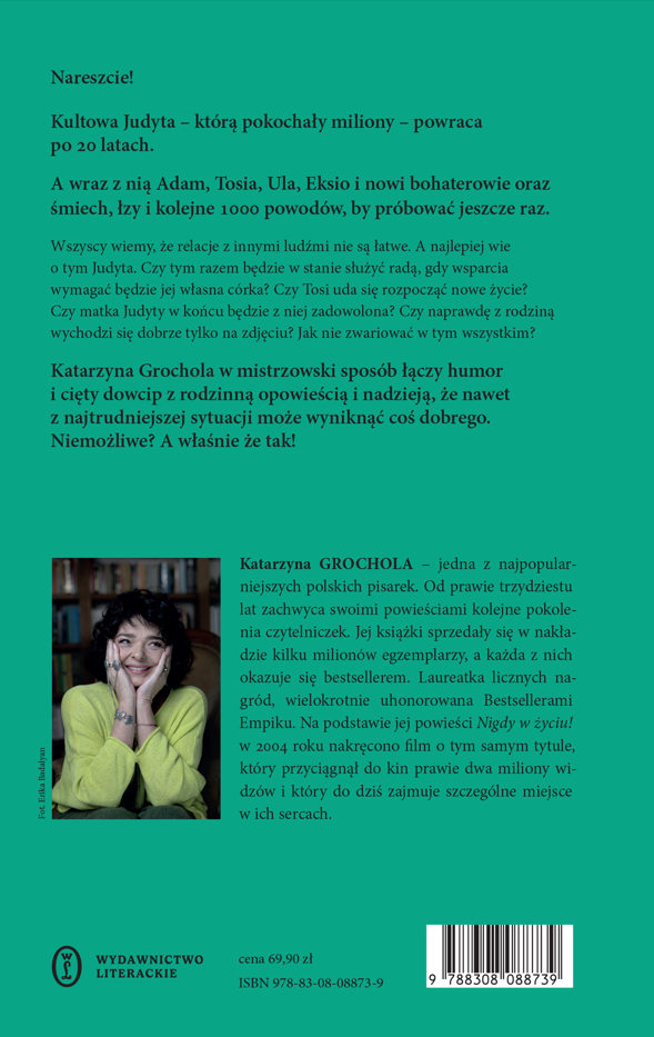 Autorka kultowego Nigdy w życiu! powraca z uwielbianymi bohaterami – dojrzalszymi, nieco innymi, a jednak wciąż z taką samą werwą i humorem. Powrót Judyty to brawurowa odpowiedź na pytanie, co stało się nie tylko z nią, ale przede wszystkim z nami, gdy życie napisało kolejne rozdziały przez 20 lat.