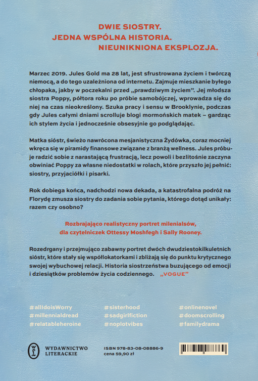 Marzec 2019. Jules Gold ma 28 lat, jest sfrustrowana życiem i twórczą niemocą, a do tego uzależniona od internetu. Zajmuje mieszkanie byłego chłopaka, jakby w poczekalni przed „prawdziwym życiem”. Jej młodsza siostra Poppy, półtora roku po próbie samobójczej, wprowadza się do niej na czas nieokreślony. Szuka pracy i sensu w Brooklynie, podczas gdy Jules całymi dniami scrolluje blogi mormońskich matek – gardząc ich stylem życia i jednocześnie obsesyjnie go podglądając.