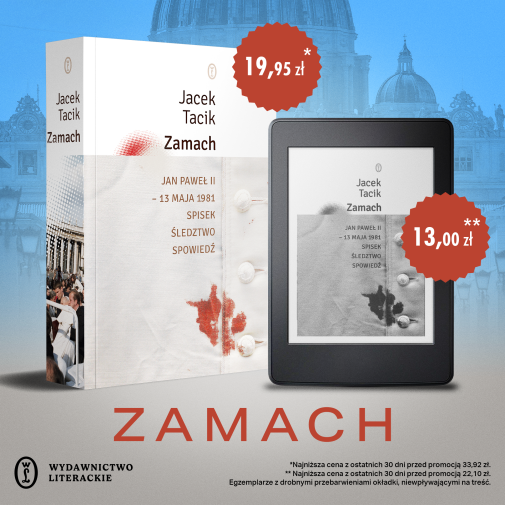 Cały świat zamarł, kiedy 13 maja 1981 roku głównym placem Watykanu wstrząsnął huk wystrzałów. Czy Jan Paweł II przeżyje? – to pytanie cisnęło się na usta milionów wiernych pod każdą szerokością geograficzną. Na ekrany kin wchodzi właśnie „Zamach na papieża” w reżyserii Władysława Pasikowskiego. Z tej okazji przypominamy reportaż Jacka Tacika „Zamach. Jan Paweł II – 13 maja 1981. Spisek. Śledztwo. Spowiedź”. Autor spotkał się i rozmawiał z 26 osobami, w tym z zamachowcem. Przemierzył 45 tysięcy kilometrów, trzy kontynenty i pracował przez tysiąc dni, aby odsłonić nam kulisy tego dramatycznego wydarzenia, choć dla każdej z tych dwudziestu sześciu osób prawda ma inne oblicze. I to sprawia, że „Zamach…” jest fascynującą lekturą!